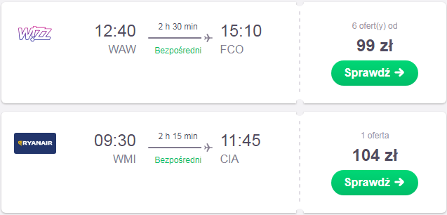 Proponujemy wylot dzień przed meczem 30.10 z portu Warszawa Chopin za 54 zł* (cena regularna 99 zł) lub Warszawa Modlin za 104 zł (cena dla wszystkich) odpowiednio do portu Rzym Fumicino i Rzym Ciampino REZERWUJ====>