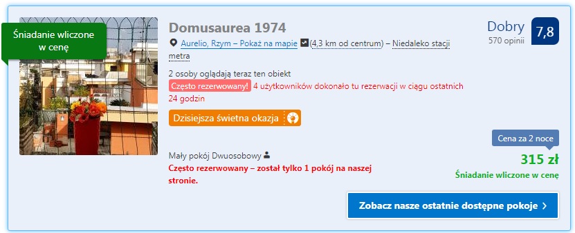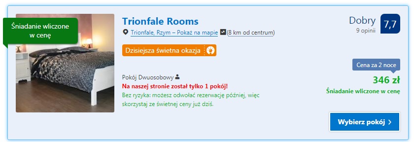 Zakwaterowanie proponujemy w poniższych obiektach, które są oddalone o niecałe 5 km od Stadio Olimpico. Pierwszy jest Domusaurea 1974 gdzie za pokój dwuosobowy ze śniadaniem zapłacimy 316zł ( 158zł/os./noc). Drugim obiektem jest Trionfale Rooms. Koszt pobytu wraz ze śniadaniem wynosi 346zł ( 173zł/ os./noc ). W obu kwaterach należy wliczyć podatek miejski za noc 3.50EUR ( 15zł za dobę ).