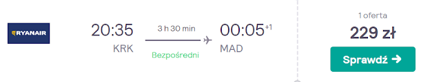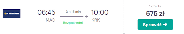 Ze stolicy Hiszpanii wracamy 23 października. Do wyboru mamy przesiadkowy lot (w Londyn Stansted) do Warszawy Modlin za 389 zł REZERWUJ====> i bezpośredni do Krakowa za 575 zł REZERWUJ====>.