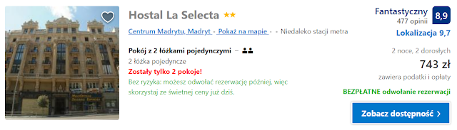 Proponujemy dwuosobowy pokój w usytuowanym w centrum Madrytu Hostal La Selecta. Koszt dwudniowego noclegu wynosi 743 zł (ok. 186 zł os./noc).
