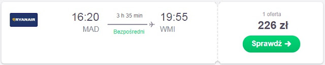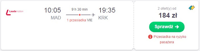 Powrót do Polski proponujemy dzień po meczu 07.11, wówczas istnieje możliwość bezpośredniego przelotu do Warszawy za 226 zł REZERWUJ====> Inna możliwość to lot z Madrytu do Krakowa (z przesiadką w Wiedniu) za 184 zł REZERWUJ====>