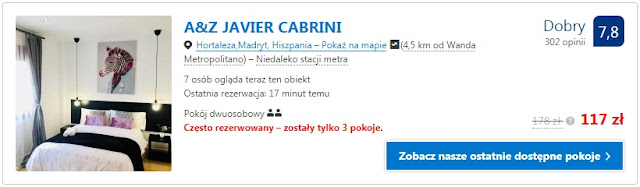 Proponujemy pobyt w dwóch miejscach położonych nieopodal Wanda Metropolitano. Pierwsza z opcji to A&Z Javier Cabrini, gdzie zapłacimy 117 zł (59 zł/os/noc). Inna możliwość to pobyt w Hotel Don Luis, w którym jedna noc dla dwóch osób to koszt 189 zł (95 zł/os/noc).