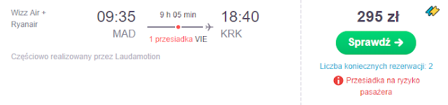 Do Wrocławia proponujemy wrócić bezpośrednio z Madrytu w sobotę 21 września za 356 zł REZERWUJ====>. Natomiast w przypadku powrotu do Krakowa najkorzystniejszą opcją wydaje się być przelot z przesiadką w Wiedniu również w sobotę za 250 zł* (cena regularna 295 zł) REZERWUJ====>