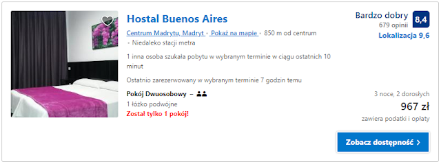 Proponujemy nocleg w obiekcie Hostal Buenos Aires, oddalonym jedyne 850 m od centrum miasta i znajdującym się blisko stacji metra. Koszt pobytu w dniach 18-21 września dla jednej osoby to 914 zł (305 zł/osoba/doba). Dla dwóch osób cena to 967 zł (162 zł/osoba/doba).