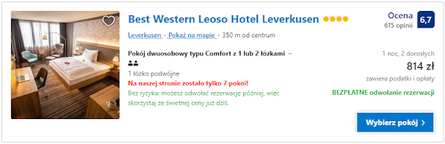 Dla tych, którzy po meczu chcą zostać w Leverkusen dobrą opcją będzie Best Western Leoso Hotel Leverkusen. W tym obiekcie nocleg dla jednej/dwóch osób kosztować będzie 814 zł za dobę.