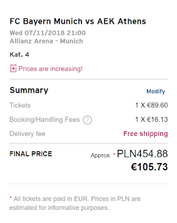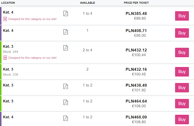 Wejściówki otrzymamy za pośrednictwem rynku wtórnego. Ceny wraz z opłatami manipulacyjnymi rozpoczynają się od 106 EUR (ok. 455 zł) REZERWUJ====>