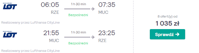Do Monachium dotrzemy wygodnie i szybko na pokładzie samolotu linii lotniczych LOT. Za przeloty w dwie strony z Warszawy zapłacimy 875 zł REZERWUJ====>, a z Rzeszowa 1035 zł REZERWUJ====>.