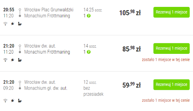 Podróż do Monachium planujemy w dniach 4-6 listopada. Za przejazd z Wrocławia i z powrotem możemy zapłacić 209 zł w przypadku powrotu zaraz po meczu lub 190 zł w opcji z noclegiem REZERWUJ====>, z kolei podróż z Warszawy będzie kosztować 250 zł REZERWUJ=====>.