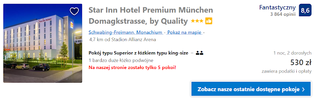 Dla kibiców, którzy zadecydują pozostać na noc w Monachium oferujemy zlokalizowany niecałe 5 kilometrów od stadionu Allianz Arena Star Inn Hotel Premium München Domagkstrasse, by Quality. Za jednodniowy nocleg zapłacimy 672 zł za jedną oraz 443 zł za dwie osoby (221,5 zł os./noc).
