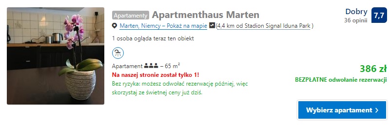 Proponujemy nocleg w Apartmenthaus Marten gdzie za noc w pokoju dwuosobowym (wliczając podatek miejski) zapłacimy 415 zł ( ok. 208 zł/os.)