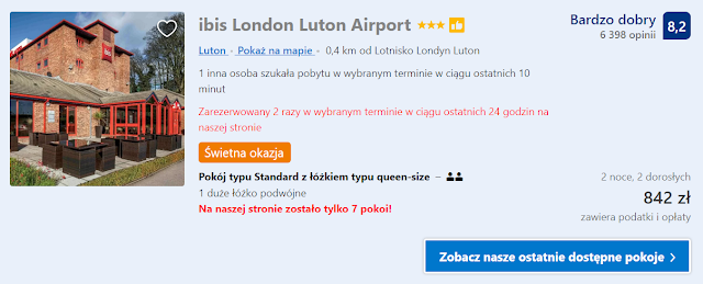 Dla kibiców, którzy preferują nocleg nieopodal lotniska w Luton polecamy oddalony o 400 metrów od portu lotniczego ibis London Luton Airport. Kosz pobytu wynosi 911 zł za jedną oraz 835 zł za dwie osoby (ok. 209 zł os./noc).