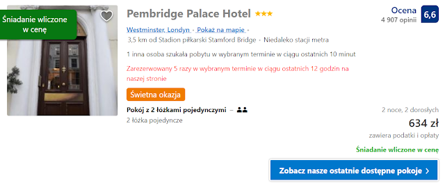 Alternatywą może być zlokalizowany 3,5 km od stadionu Stamford Bridge Pembridge Palace Hotel, który oferuje nocleg w kwocie 582 zł za pokój jednoosobowy oraz 629 zł za pokój dwuosobowy (ok. 157,5 zł os./noc).