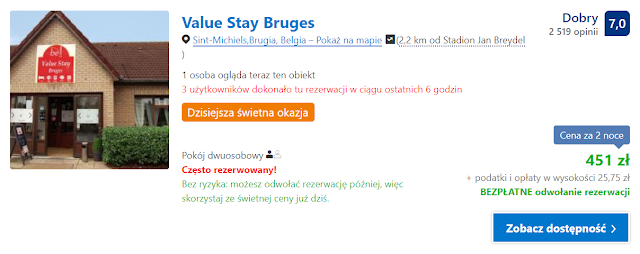 Najwygodniejszym rozwiązaniem będzie nocleg w dniach 10-12 grudnia w Value Stay Bruges. Kwatera znajduje się dwa kilometry od stadionu, a koszt pobytu w pokoju jedno i dwuosobowym wraz z opłatami kosztuje 399 zł (ok. 100 zł os./noc).