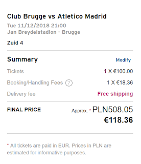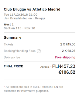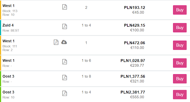 Obecnie jedynym źródłem skąd nabędziemy wejściówki jest rynek wtórny. W przypadku zakupu dwóch biletów ich koszt wynosi 106,5 EUR (ok. 457 zł. 228,5 os./bilet). W sytuacji pojedynczej rezerwacji zapłacimy 118,36 EUR (ok. 508 zł) REZERWUJ====>.