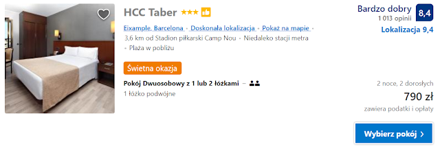 Oferujemy obiekty znajdujące się w promieniu czterech kilometrów od stadionu Camp Nou. Pierwszy z nich to HCC Taber. Obiekt ten oferuje dwudniowy nocleg od 784 zł za pokój jednoosobowy oraz 790 zł za pokój dwuosobowy (197,5 zł os./noc).