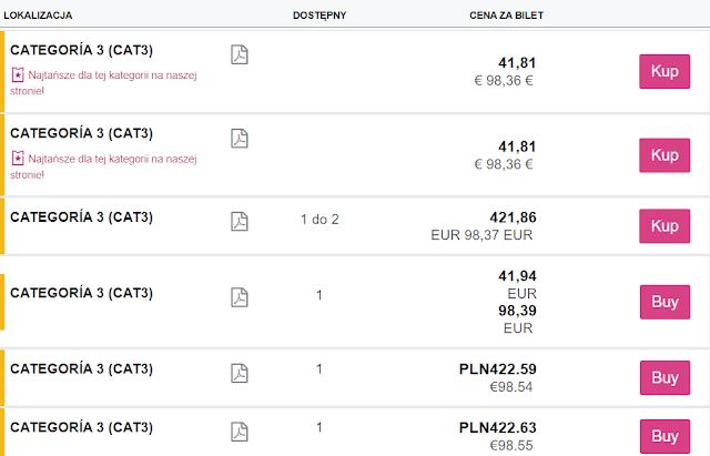 Aktualnie wejściówki można zakupić na rynku wtórnym. Ceny (wraz z opłatami manipulacyjnymi) rozpoczynają się od 116 EUR (ok. 497 zł) REZERWUJ====>