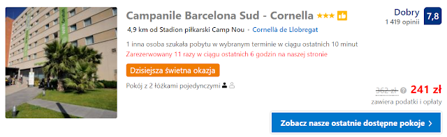 Drugą propozycją jest Campanile Barcelona Sud – Cornella. Nocleg w tym obiekcie w dniach 16-17 kwietnia kosztuje 253 zł* za pokój jednoosobowy oraz 255 zł* za pokój dwuosobowy (127,5 zł os./noc).