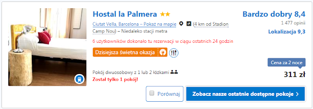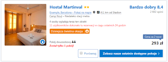 Proponujemy nocleg w obiektach: Hostal Martinval – wysokooceniany przez użytkowników, niedaleko Camp Nou ok. 4 km, w pobliżu stacji metra pokój dwuosobowy za 293 zł za dwie noce (ok.73 zł za osobę za noc) . Hostal la Palmera wysokooceniany przez użytkowników, niedaleko Camp Nou ok. 4 km, w pobliżu stacji metra pokój dwuosobowy z jednym lub dwoma łóżkami za 311 zł za dwie noce (ok 78 zł za osobę za noc)