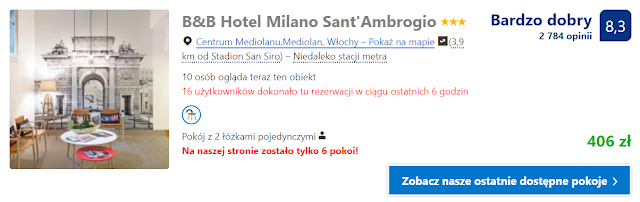 Proponujemy obiekty, które znajdują się nieopodal San Siro. Pierwszy z nich to La Corte del 26. Cena pobytu w dniach 6-7 listopada w pokoju jednoosobowym wynosi 175 zł (plus podatek miejski 3 EUR – ok. 13 zł). Inną opcją może być B&B Hotel Milano Sant’Ambrogio. Pobyt w pokoju dwuosobowym kosztuje 406 zł (203 zł os./noc). Do ceny również należy doliczyć podatek miejski w wysokości 3 EUR (ok. 13 zł).