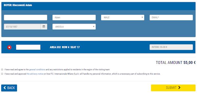 Podczas pisania naszej propozycji na stronie Interu Mediolan pojawiły się bilety w otwartej dystrybucji. Najtańsze możliwe aktualnie na stronie bilety kosztują 55 EUR (ok 244 zł). Jako, że bilety są bardzo szybko wyprzedawane pozostawiamy obie opcje zakupu biletu zarówno rynek wtórny REZERWUJ====> jak i sprzedaż klubową REZERWUJ====>