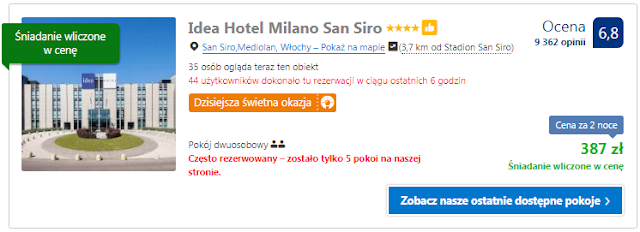 Proponujemy nocleg w Idea Hotel Milano San Siro. Obiekt znajduje się niecałe 4 km od stadionu. Za pokój dwuosobowy ze śniadaniem wliczonym w cenę zapłacimy 387 zł za dwie noce (ok. 194 zł za osobę). Warto zaznaczyć również, że we Włoszech obowiązuje zapłata podatku miejskiego w kwocie 5 EUR za osobę za noc ok 88 zł ( 44 zł za osobę).
