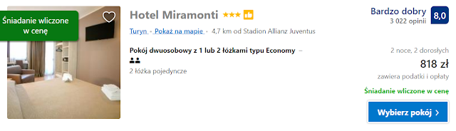 Najwięksi sympatycy Juve na pewno będą zachwyceni zlokalizowanym niecałe 5 kilometrów od Allianz Stadium Hotel Miramonti. Koszt dwudniowego noclegu ze śniadaniem wynosi 775 zł za pokój jednoosobowy oraz 818 zł za pokój dwuosobowy (204,5 zł os./noc).