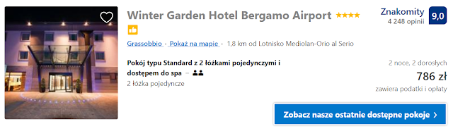 Dla kibiców, którzy preferują nocleg nieopodal lotniska Mediolan Bergamo proponujemy Winter Garden Hotel Bergamo Airport, który oferuje nocleg dla jednej/dwóch osób w kwocie 704/786 zł (196,5 zł os./noc).