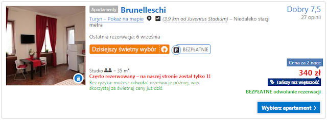 Na jeden lub dwa noclegi proponujemy apartament Brunelleschi. Wysokooceniany obiekt przez użytkowników serwisu Booking.com. położony w pobliżu stadionu ok 3,9 km. Za dwie noce zapłacimy 340 zł (ok .85 zł za osobę za noc).