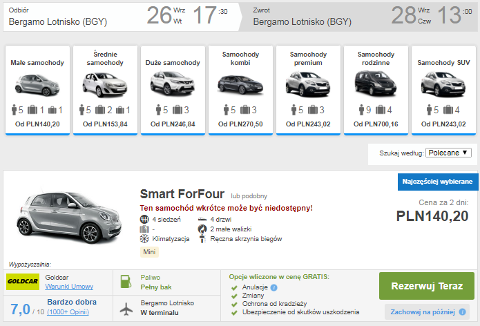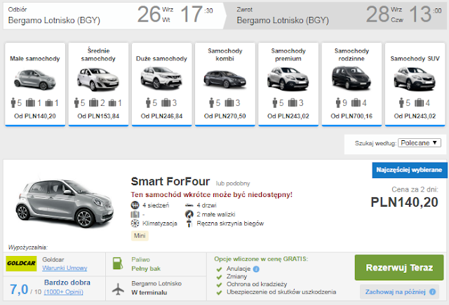 Jak zwykle proponujemy wynajęcie auta na czas pobytu we Włoszech. Ceny za wynajem za 2 dni wydają się atrakcyjne dodatkowo odejdzie nam rezerwacja transferów lotniskowych do Turynu. Auto możemy odebrać i zostawić na lotnisku w Bergamo. Cena za 2 dni wynajęcia auta czteroosobowego to koszt rzędu już od ok.140 zł ( w przypadku 2 osób daje koszt ok 35 zł za osobę za dzień) REZERWUJ====>