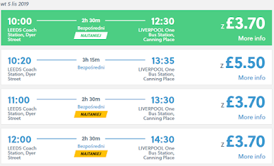 Z lotniska Leeds/Bradford do centrum Leeds dotrzemy autobusem nr 757 przewoźnika Flying Tiger za 3,80 GBP (ok. 20 zł). Więcej informacji wraz z rozkładem jazdy znajdziemy na stronie przewoźnika. Z Leeds do Liverpoolu dotrzemy dzięki National Express, a za bilety zapłacimy od 3.70 GBP (ok. 20 zł) REZERWUJ====>. Z kolei do lotniska w Liverpoolu dotrzemy komunikacją miejską (linie nr 500 i 86A) za 2,30 GBP (ok. 12 zł), a godziny połączeń sprawdzimy tutaj.