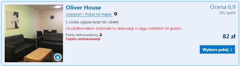 Dla poszukujących noclegu proponujemy Olivier House w centrum Liverpoolu (3,4 km od stadionu) gdzie za pokój 1-osobowy zapłacimy 82 zł.