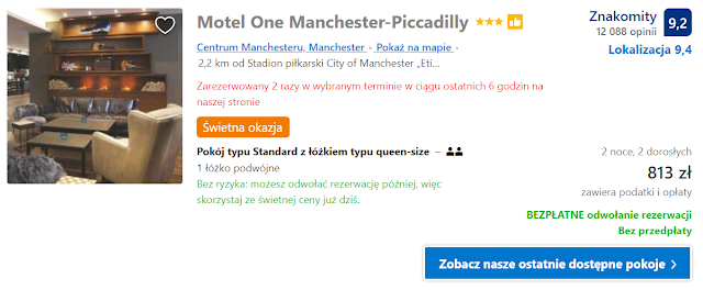 Jeszcze bliżej boiska obywateli zlokalizowany jest Motel One Manchester-Piccadilly, który oferuje nocleg w cenie 668 zł za jedną oraz 813 zł za dwie osoby (ok. 203,5 zł os./noc).