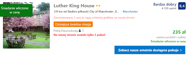 Proponujemy obiekt Luther King House. Nocleg w tym hotelu kosztuje 180 zł za jedną oraz 235 zł za dwie osoby (117,5 zł os./noc). W cenę wliczono śniadanie.