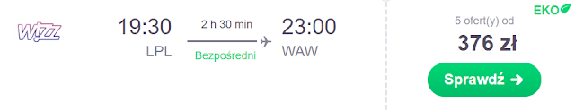 Lot rezerwujemy na 18 kwietnia. Z Liverpoolu wrócimy do Warszawy Modlin za 327 zł REZERWUJ====>, Katowic za 339 zł* (cena regularna 376 zł) REZERWUJ====> i Warszawy za 339 zł* (cena regularna 376 zł) REZERWUJ====>. Natomiast z Leeds dolecimy do Gdańska za 302 zł REZERWUJ====>.
