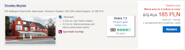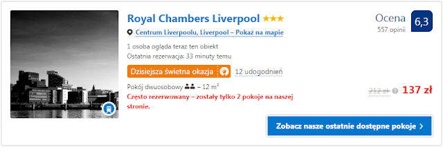 Jedną noc w Manchesterze proponujemy w Trivelles Mayfair. Cena za pokój dwuosobowy to 185 zł (92,5 zł za osobę za noc). Gdybyśmy zdecydowali się na powrót z lotniska w Liverpoolu warto rozpatrzyć nocleg właśnie w tym mieście aby zdążyć na poranny samolot. Polecamy Royal Chambers Liverpool gdzie za nocleg w pokoju dwuosobowym zapłacimy 137 zł (68,5 zł za osobę za noc).