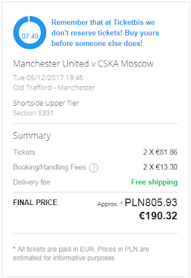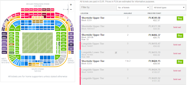 Bilet na mecz kupimy na stronie rynku wtórnym, gdzie najtańsze pojedyncze wejściówki można nabyć za ok. 403 zł (opcja przy zakupie dwóch biletów). Warto pamiętać, że bilet może być dostarczony tylko na terenie UK, w związku z czym należy uprzedzić hotel o nadejściu przesyłki, bądź znajomego u którego będziemy nocować podczas pobytu w Anglii. Uwaga! Nie przechodzimy na polską wersję (Stubhub) a pozostajemy w angielskiej wersji strony (ticketbis.net) – znajdziemy tam zdecydowanie tańsze bilety! REZERWUJ====>