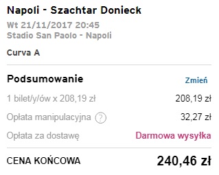 Nie ma jeszcze biletów w oficjalnej sprzedaży na ten mecz, jednak dla tych co nie chcą czekać z kupnem do nabycia są bilety na rynku wtórnym. Ceny zaczynają się już od ok. 240zł. Pamiętajmy, że wybierając zakup biletu poprzez ten kanał jesteśmy zobligowani do zamówienia biletu na terenie Włoch. Warto w tej sytuacji poinformować hotel/znajomego w zależności, gdzie będziecie nocować podczas pobytu o spodziewanej przesyłce. Nie przechodzimy na polską wersję (Stubhub) a pozostajemy w angielskiej wersji strony (ticketbis.net) ceny są zdecydowanie lepsze REZERWUJ====>