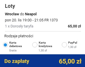 Do Neapolu możemy lecieć dzień przed meczem (20.11) z Wrocławia linią Ryanair (65zł) REZERWUJ====> lub w dniu meczu (21.11) z Katowic linią Wizzair (44zł*, cena regularna 89zł) REZERWUJ====>. Powrót dzień po meczu (22.11) linią Wizzair do Warszawy (19,99€* = ok. 86zł, cena regularna 29,99€ = ok. 129zł) REZERWUJ====>.