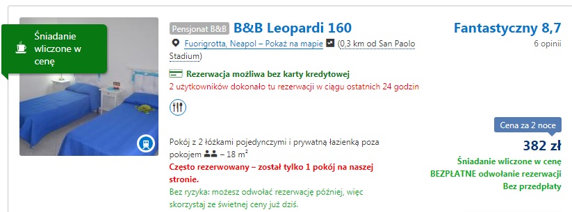 Na nocleg proponujemy bardzo wysoko oceniane miejsce 300m od stadionu – B&B Leopardi 160 gdzie za 2 noce dla 2 osób ze śniadaniem zapłacimy 382zł (95,5zł/os/noc).
