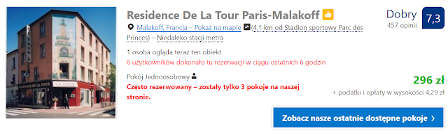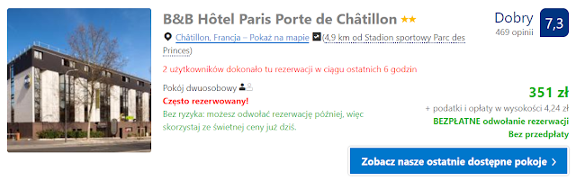 Oferujemy Residence De La Tour Paris-Malakoff, który oferuje pokoje jedno jak i dwuosobowe. Za nocleg w dniach 28-29 listopada zapłacimy kolejno 296 zł (plus podatek 4,29 zł) oraz 339 zł ( 169,5 os./noc plus podatek 8,57 zł). Alternatywą może być B&B Hôtel Paris Porte de Châtillon. Tutaj za nocleg w tych samych dniach w pokoju dwuosobowym zapłacimy 351 zł (plus podatek 8,49).