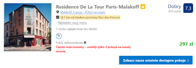 Oferujemy nocleg w Residence De La Tour Paris – Malakoff. Pobyt w dniach 24-25 października w pokoju jednoosobowym kosztuje 297 zł. Drugim obiektem w przypadku noclegu dla dwóch osób będzie Hôtel du Parc gdzie za noc w pokoju dwuosobowym zapłacimy ok. 397 zł (ok. 199 zł/os. – w cenę wliczyliśmy podatek miejski)