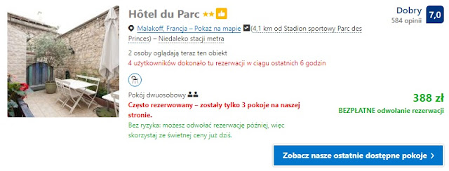 Oferujemy nocleg w Residence De La Tour Paris – Malakoff. Pobyt w dniach 24-25 października w pokoju jednoosobowym kosztuje 297 zł. Drugim obiektem w przypadku noclegu dla dwóch osób będzie Hôtel du Parc gdzie za noc w pokoju dwuosobowym zapłacimy ok. 397 zł (ok. 199 zł/os. – w cenę wliczyliśmy podatek miejski)