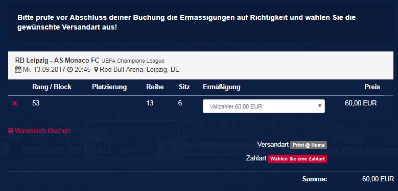 Bilety na mecz do kupienia na oficjalnej stronie klubu z Lipska => https://tickets.dierotenbullen.com/online/index.php?wes=empty_session_111&language=1&query_pos=0&query_rows=250&set_query_pos=0&houseid=547&performanceid=2453&state=3&nextstate=4 gdzie miejsca wybieramy z planu stadionu. Najtańsze bilety do kupienia za 60€ (ok. 258zł) przy własnym wydruku.