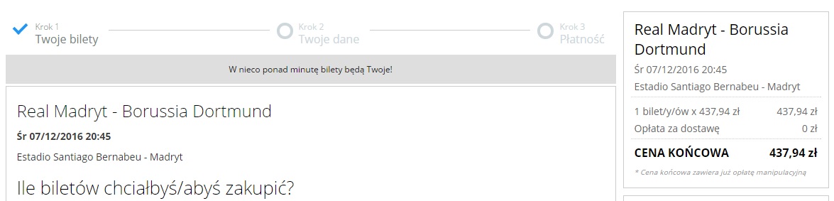 Bilet na mecz kupujemy na stronie viagogo => http://www.viagogo.pl/Sports-Tickets/Football/UEFA-Champions-League/UEFA-Champions-League-2016-17-Tickets/E-1961959 albo na stronie ticketbis => http://www.ticketbis.com/pl/bilety-na-real-madryt-borussia-dortmund/ev109439