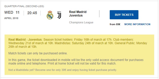 W najbliższym czasie ruszy sprzedaż za pośrednictwem oficjalnej strony internetowej Realu Madryt . Otwarta sprzedaż została ustalona na 26 marca na godzinę 10.00 a dla posiadaczy kart Madridista 24 marca również od 10.00. Jeśli bardzo zależy nam na otrzymaniu biletów należy dobrze przygotować się do tej sprzedaży i nie przespać terminu. Aby zwiększyć prawdopodobieństwo zakupu sugerujemy również nabycie wspomnianej karty Madridista (koszt 30 EUR ok. 129 zł) . Bilety mogą zniknąć w przeciągu kilku minut a ilość przeznaczona na otwartą sprzedaż może być niewielka. Cena biletów będzie zaczyna się od 85 EUR +2,5 EUR opłaty= ok. 370 zł.