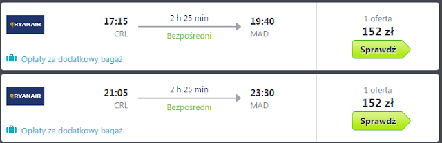 Dla preferujących wylot trochę szybciej niż w dniu samego spotkania proponujemy wylot dzień wcześniej czyli 17.10.2016 z rożnych portów w Polsce do Brukseli Charleroi: Wizz Air z Gdańska za 39 zł (cena dla wszystkich), Ryanair z Krakowa 161 zł, Ryanair z Warszawy Modlin 102 zł zarezerwuj TUTAJ =====>. Z Charleroi do Madrytu możemy wybrać jedną z 2 opcji wylotu tak aby współgrała z lotami z Polski tj. wylot o 17:15 lub 21:05 – za jeden i drugi zapłacimy tą samą cenę 152 zł zarezerwuj TUTAJ=====> .