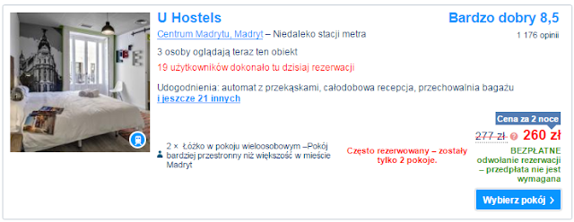 Noclegi proponujemy w dobrze ocenionych hotelach/hostelach w serwisie Booking.com. Cena w pokoju dwuosobowym kształtuje się w granicach 265 zł za pokój za 2 noce (132,5 zł za osobę za 2 noce) zarezerwuj TUTAJ=====>. W przypadku pozostania na w Madrycie na jedną noc koszty będą jeszcze niższe. Jak zwykle zachęcamy rownież do korzystania z poularnego serwius wynajmu apartamentów/pokoi Airbnb.pl. W przypadku skorzystanie z oferty z naszego linku zarezerwuj TUTAJ=====> otrzymują Państwo 85 zł zniżki na 1 rezerwację!