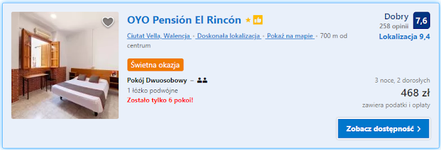 Proponujemy Państwu zatrzymać się w ścisłym centrum miasta w obiekcie OYO Pension el Rincon. Za trzydniowy pobyt dla jednej osoby zapłacimy tutaj 455 zł (ok. 152 zł/osoba/doba), a dla dwóch osób koszt zwiększy się jedynie do 478 zł (ok. 80 zł/osoba/doba).