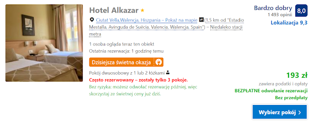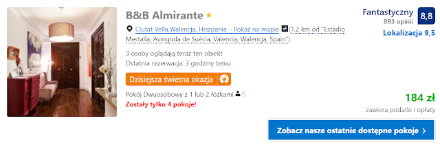 Ze względów lokalizacyjnych polecamy obiekty, które znajdują się niedaleko Estadio Mestalla. Pierwszy z nich to Hotel Alkazar. Koszt pobytu w dniach 12-13 grudnia wynosi 193 zł za pokój jednoosobowy. Inną opcją pozostaje B&B Almirante gdzie za nocleg w pokoju dwuosobowym zapłacimy 184 zł (92 zł os./noc).