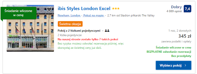 Pierwsza propozycja noclegowa to hotel sieci Ibis – ibis Styles London Excel, znajdujący się w gminie Newham w niedużej odległości od stadionu gospodarzy. Za pobyt na jedną noc z 13-ego na 14-ego grudnia w tym obiekcie wraz ze śniadaniem zapłacimy 345 zł za jedną lub dwie osoby.